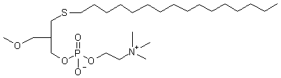 The reaction of 2-(hydroxymethyl)propenoic acid ethyl ester (I) with PBr3 and then with hexadecyl mercaptane (II) and TEA gives 2-(hexadecylsulfanylmethyl)propenoic acid methyl ester (III), which is reduced with DIBAL in THF to the corresponding carbinol (IV). The methylation of (IV) with methyl iodide and NaH in THF affords the methyl ether (V), which is hydroxylated at the double bond with BH3/Me2S and NaBO3 providing 3-(hexadecylsulfanyl)-2-(methoxymethyl)-1-propanol (VI). Finally this compound is treated with POCl3 and TEA in chloroform and condensed with choline tosylate (VII) to furnish the target phosphorylcholine derivative.