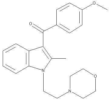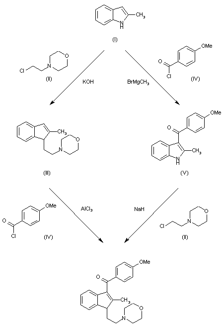 This compound can be obtained by two related ways: 1) The condensation of 2-methylindole (I) with 2-morpholinoethyl chloride (II) by means of KOH in hot DMSO gives 1-(2-morpholinoethyl)-2-methylindole (III), which is then submitted to a Friedel-Craft's reaction with 4-methoxybenzoyl chloride (IV) by means of AlCl3 in dichloromethane or ethylene dichloride. 2) The condensation of indole (I) with acyl chloride (IV) by means of methylmagnesium bromide in anhydrous ethyl ether gives 2-methyl-3-(4-methoxy benzoyl)indole (V), which is then condensed with morpholine (II) by means of K2CO3 in DMF.