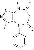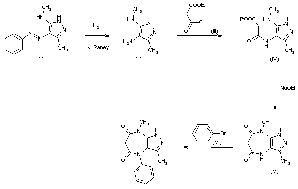 The reductive cleavage of 4-phenylazo-3-methyl-5-methylaminopyrazole (I) with H2 over RaNi in ethanol gives 4-amino-3-methyl-5-methylaminopyrazole (II), which is acylated with ethoxycarbonylacetyl chloride (III) in toluene yielding 4-(ethoxycarbonylacetylamino)-3-methyl-5-methylaminopyrazole (IV). The cyclization of (IV) by means of sodium ethoxide in ethanol affords 4,8-dihydro-3,8-dimethylpyrazolo[3,4b][1,4]diazepine-5,7(1H,6H) dione (V), which is finally phenylated by a treatment with powdered Cu and potassium acetate in refluxing bromobenzene