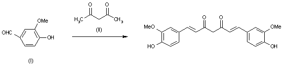 Synthesis of curcumin was first described by Lampe et al. In our laboratory curcumin has been synthesized by condensing vanillin (I) and acetyl acetone (II) in a medium of ethyl acetate using tributylborate as boron complex to avoid Knoevenagel condensation at C-3 of acetyl acetone. Curcumin is isolated from the reaction mixture by acidification and extraction with ethyl acetate. The organic layers are washed until neutral, dried and the solvent is removed. purified by chromatography over silica gel using ether/petroleum ether as the solvent.