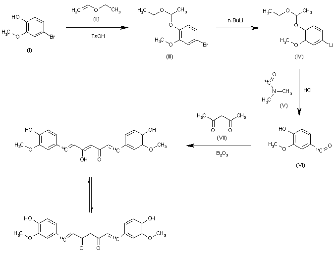 The protection of 4-bromo-2-methoxyphenol (I) with ethyl vinyl ether (II) and TsOH in dichloromethane gives the ethoxyethyl ether (III), which is treated with n-BuLi in THF to yield the phenyl lithium compound (IV). The reaction of (IV) with 14C-labeled DMF (V), followed by hydrolysis with HCl, affords the labeled 4-hydroxy-3-methoxybenzaldehyde (VI), which is finally condensed with pentane-2,4-dione (VII) by means of B2O3 and tetrahydroquinoline in DMF.
