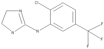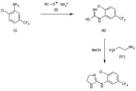 The reaction of 2-chloro-5-tritluoromethylaniline (I) with ammonium thiocyanate (II) in hot chlorobenzene gives N-(2-chloro-5-trifluoromethylphenyl)isothiourea (III), whith is cyclized with ethylenediamine (IV) in refluxing methanol.