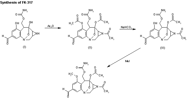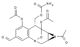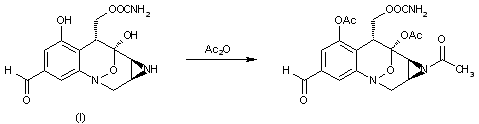 By acetylation of 8-carbamoyloxymethyl-5-formyl-7,9-dihydroxy-3,9-epoxy-1,1a,2,8,9,9a-octahydroazirino[2,3-c][1]benzazocine (FR-900482) (I) with acetic anhydride - pyridine.