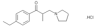 By condensation of pyrrolidine (I) with paraformaldehyde (II) and 4-ethylpropiophenone (III) by means of dry HCl in refluxing ethyl acetate.