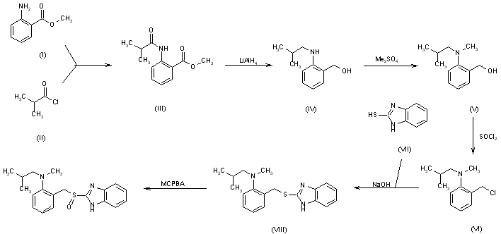 The acylation of methylanthranilate (I) with isobutyryl chloride (II) gives 2-isobutyramidobenzoic acid methyl ester (III), which is reduced with LiAlH4 to 2-(isobutylamino)benzyl alcohol (IV). The methylation of (IV) with dimethyl sulfate yields 2-(N-isobutyl-N-methylamino)benzyl alcohol (V), which is treated with SOCl2 to afford the corresponding benzyl chloride (VI). The condensation of (VI) with benzimidazole-2-thiol (VII) by means of NaOH yields 2-[2-(N-isobutyl-N-methylamino)benzylsulfanyl)benzimidazole (VIII), which is finally oxidized with m-chloroperbenzoic acid (MCPBA) as usual.