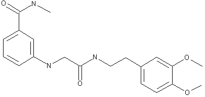 The reaction of 3-nitrobenzoic acid (I) with refluxing SOCl2 gives the corresponding acyl chloride (II), which by reaction with methylamine in chloroform is converted to the methylamide (III). The reduction of (III) with H2 over RaNi in methanol yields the 3-amino-N-methylbenzamide (IV), which is finally condensed with 2-chloro-N-[2-(3,4-dimethoxyphenyl)ethyl]acetamide (V) by means of NaI and CaCO3 in hot DMF.