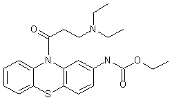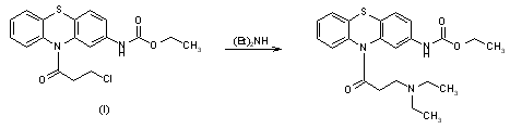 By reaction of 10-(3-chloropropionyl)-2-(ethoxycarbonylamino)phenothiazine (I) with diethylamine in refluxing toluene.