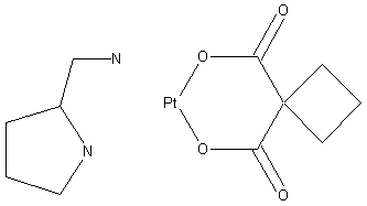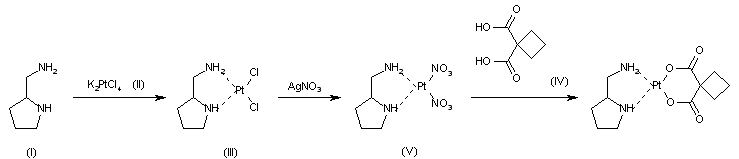 The reaction of 2 aminomethylpyrrolidine (I) with potassium tetrachloropiatinum (II) gives dichloro piatinum complex (III), which is nitrated with silver nitrate and followed by substitution with cyclobutanedicarboxylate (IV).