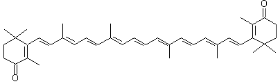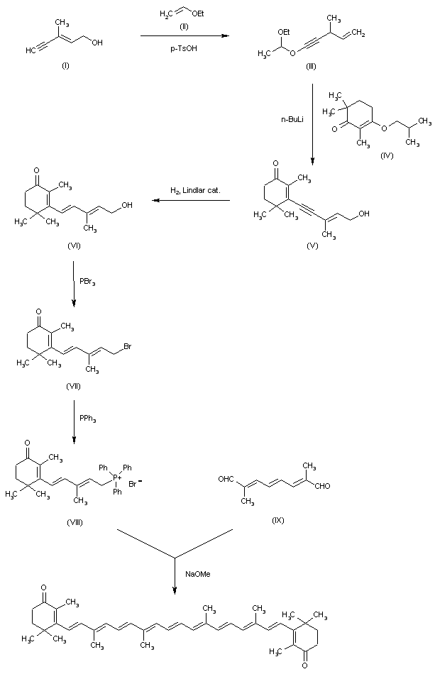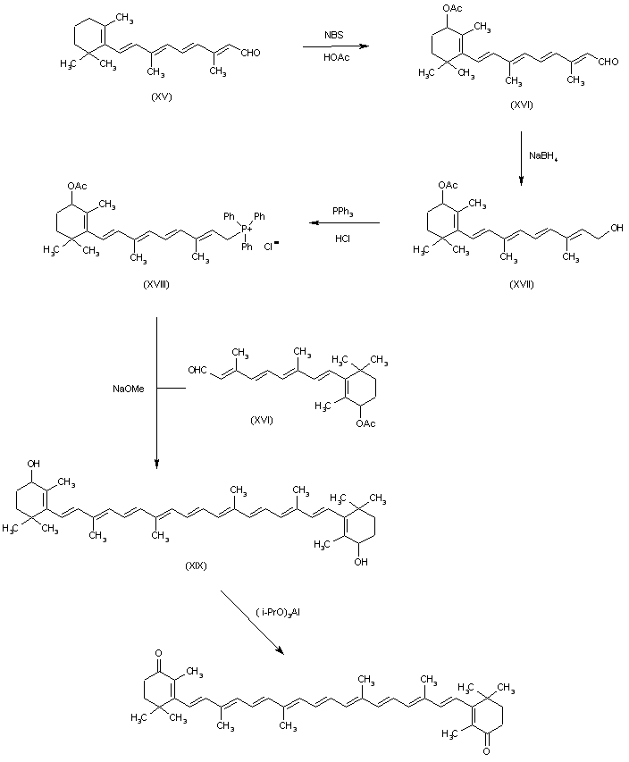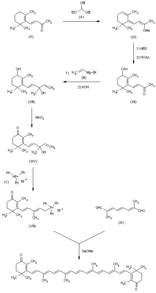 The reaction of beta-ionon (X) with triethyl orthoformate (A) by means of H2SO4 in dioxane gives beta-ionon enolether (XI), which by reaction with NBS in CCl4 and hydrolysis with acetic acid is converted into 4-acetoxyonon (XII). The Grignard reaction of (XII) with vinylmagnesium bromide (B) in THF and hydrolysis with KOH in methanol gives 5-(3-hydroxy-2,6,6-trimethylcyclohex-1-en-1-yl)-3-methylpenta-1,4-dien-3-ol (XIII), which is oxidized with MnO2 in methylene chloride yielding 5-(3-oxo-2,6,6-trimethylcyclohex-1-en-1-yl)-3-methylpenta-1,4-dien-3-ol (XIV). Finally, this compound by reaction with triphenylphosphonium bromide (C) in DMF is converted into the phosphonium salt (VIII), which is finally condensed in a Wittig reaction with 2,7-dimethyl-2,4,6-octatriene-1,8-dial (IX) by means of sodium methoxide in dichloromethane.