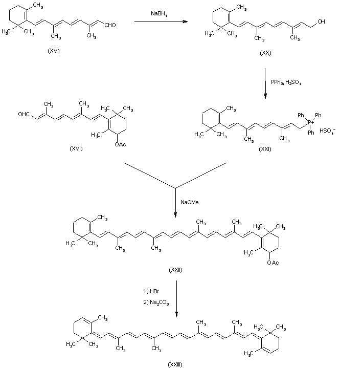 The reduction of retinene (XV) with NaBH4 in methanol gives retinol (XX), which by reaction with triphenylphosphine and H2SO4 is converted into retinyltriphenylphosphonium sulfate (XXI). The Wittig reaction of (XXI) with aldehyde (XVI) by means of sodium methoxide in benzene - methanol yields 3-acetylisocryptoxanthin (XXII), which by reaction with aqueous 68% HBr in methylene chloride, followed by a treatment with Na2CO3 affords dehydro-retro-carotene (XXIII).