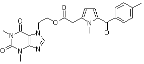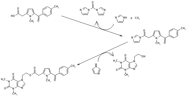 The reaction for preparing the esters is shown schematically by the condensation of 1-methyl-5-(4-methylbenzoyl)pyrrol-2-acetic acid and 7-(2-oxyethyl)theophylline as a general example, giving rise to the formation of the 1-methyl-5-(4-methylbenzoyl)pyrrol-2-acetate of 7-(2-oxyethyl)theophylline.