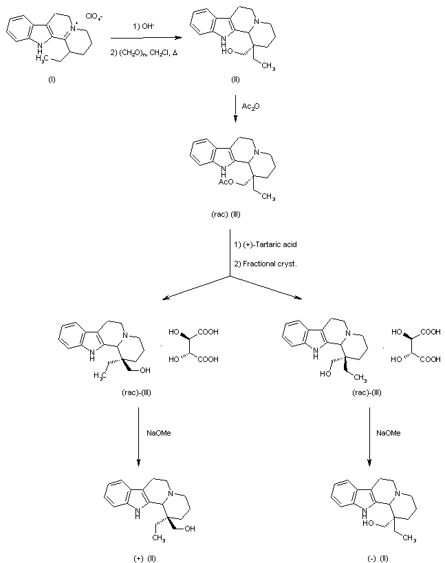 Conversion of racemic 1-ethyl-2,3,4,6,7,10-hexahydroindolo[2,3-a] quinolizine (I), an intermediate in the synthesis of vincamine, to the base and reaction of the latter with paraformaldehyde gives the 1-hydroxymethyl compound (II), which is acetylated to give the acetate (III). (III) is separated to its enantiomers by salt formation with (+)- (2R,3R)-tartaric acid, followed by fractional crystallization. Treatment of the separated tartrates with sodium methoxide gives the optically active bases, i.e., (+)-(II) and (-) (II) (RGH-2981).