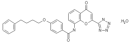 The reaction of ethyl 8-nitro-4-oxo-1-benzopyran-2-carboxylate (I) with ammonia in methanol gives the corresponding amide (II), which is dehydrated with POCl3 yielding 2-cyano-8-nitro-1-benzopyran-4-one (III). The cyclization of (III) with sodium azide by means of pyridinium chloride in hot DMF affords 8-nitro-2-(tetrazol-5-yl)-1-benzopyran-4-one (IV), which is hydrogenated with H2 over Pd/C in methanol - HCl giving 8-amino-2-(tetrazol-5-yl)-1-benzopyran-4-one (V). Finally, this compound is condensed with 4-(4-phenylbutoxy)benzoic acid (VI) by means of oxalyl chloride in dichloromethane-pyridine.