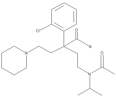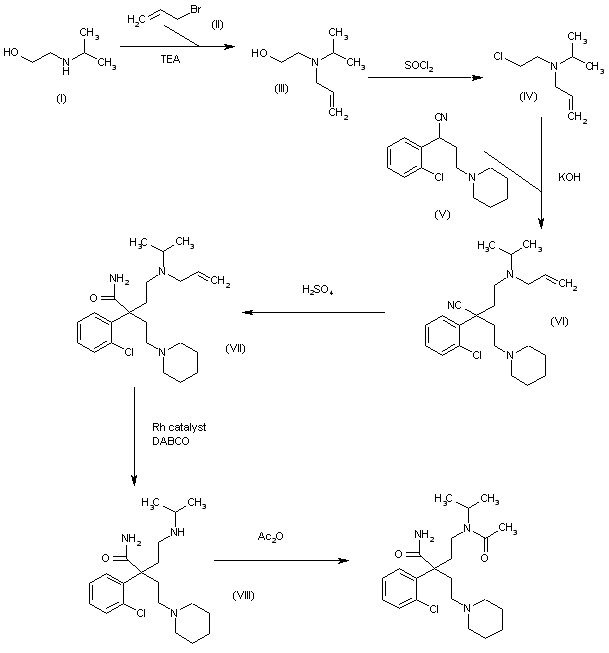 The reaction of N-isopropylethanolamine (I) with allyl bromide (II) in THF gives the secondary amine (III), which is treated with SOCl2 in dichloromethane to yield the chloroethylamine (IV). The condensation of (IV) with 2-(2-chlorophenyl)-4-(1-piperidinyl)butyronitrile (V) by means of KOH in DMSO affords the adduct (VI), whose nitrile group is hydrolyzed with H2SO4 to provide the corresponding amide (VII). The elimination of the allyl group of (VII) by means of a Rh catalyst and 1,4-diazabicyclo[2,2,2]octane (DABCO) in refluxing aqueous ethanol gives the secondary amine (VIII), which is finally acetylated with Ac2O in ethyl acetate to yield the target diamide.