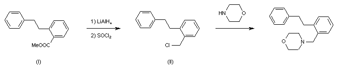 4-[2-(2-Phenylethyl)benzyl]morpholine hydrochloride (ICF-650) has been obtained as follows: Methyl 2-(2-phenylethyl)benzoate (I) is reduced (LiAlH4) to the corresponding alcohol, converted (SOCl2) to (II) and then condensed with morpholine to give ICF-650.