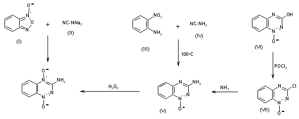 Tirapazamine can be obtained by several related ways: 1) By condensation of benzofurazan (I) with cyanamide disodium salt (II) in hot methanol/water. 2) The condensation of 2-nitroaniline (III) with cyanamide (IV) by heating at 100 C gives 3-amino-1,2,4-bezotriazine 1-oxide (V), which is then oxidized with 30% aqueous H2O2 in hot acetic acid. 3) The reaction of 3-hydroxy-1,2,4-benzotriazine 1-oxide (VI) with refluxing POCl3 and dimethylaniline gives 3-chloro-1,2,4-benzotriazine 1-oxide (VII), which by reaction with dry ammonia in ethanol is converted into the corresponding amino derivative (V), already obtained.