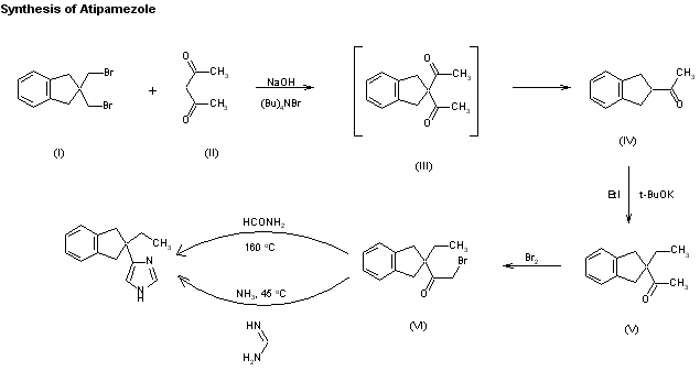 A new synthesis of atipamezole has been described: The cyclization of alpha,alpha'-dibromo-o-xylene (I) with acetylacetone (II) by means of NaOH and tetrabutylammonium bromide in toluene/water at 80 C under phase-transfer conditions gives the unstable diacetyl derivative (III), which presumably undergoes cleavage to afford 2-acetylindane (IV). The alkylation of (IV) with ethyl iodide and potassium tert-butoxide yields 2-acetyl-2-ethylindane (V), which is brominated with Br2 to give 2-(bromoacetyl)-2-ethylindane (VI). Finally, this compound is cyclized with formamide at 160 C [some 2-ethyl-2-(4-oxazolyl)indane is also formed but is easily eliminated]; the cyclization can also be carried out with formamidine in liquid ammonia.