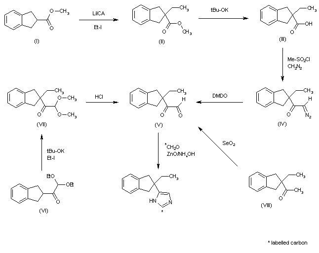 The alkylation of indane-2-carboxylic acid methyl ester (I) with ethyl iodide by means of lithium isopropylcyclohexylamide (LiICA) in THF/DMSO gives the 2-ethyl substituted compound (II), which is hydrolyzed with tBu-OK in DMSO, yielding 2-ethylindane-2-carboxylic acid (III). The reaction of (III) with methanesulfonyl chloride and diazomethane affords the alpha-diazoketone (IV), which is treated with dimethyldioxirane (DMDO) in acetone to provide the ketoaldehyde (V). Finally, this compound is cyclized with 11C-formaldehyde and NH4OH by means of ZnO in THF/water to yield the target labeled imidazole derivative. The intermediate ketoaldehyde (V) has also been obtained in two other ways: a) The alkylation of 2-(diethoxyacetyl)indane (VI) with ethyl iodide by means of tBu-OK in THF gives the corresponding 2-ethyl-substituted compound (VII), which is finally hydrolyzed to the desired ketoaldehyde (V) with HCl in THF/water. b) The oxidation of 2-acetyl-2-ethylindane (VIII) with SeO2 in hot acetic acid/water gives also the desired ketoaldehyde (V).