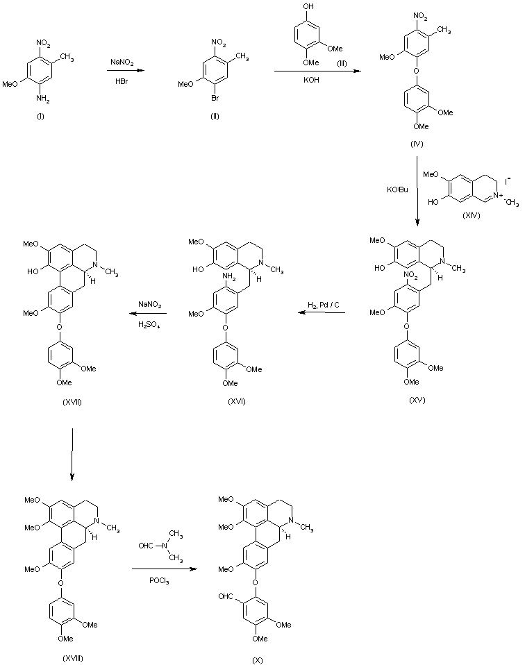 1) The Sandmeyer reaction of 3-amino-4-methoxy-6-nitrotoluene (I) with NaNO2 in acetic acid HBr gives 3-bromo-4 methoxy-6 nitrotoluene (II), which is condensed with 3,4-dimethoxyphenol (III) by means of KOH in refluxing methanol yielding the corresponding diphenyl ether (IV) The formylation of (IV) with dimethylformamide and POCl3 affords the corresponding benzaldehyde (V), which is condensed with 6,7 dimethoxy 2-methyl-3,4-dihydro isoquinolinium iodide (VI) by means of NaH in dimethylacetamide to give 1-[2-nitro-4-methoxy-5-(2-formyl-4,5-dimethoxyphenoxy)benzyl]-6,7-dimethoxy-2 methyl-1,2,3,4-tetrahydroisoquinoline (VII). The reaction of (VII) with ethylene glycol and p-toluenesulfonic acid affords the corresponding ethylene ketal (VIII), which is reduced with H2 over Pd/C in ethanol to the amine (IX). The Pschorr cyclization of (IX) with NaNO2 in acetic acid - H2SO4 affords the tetracyclic aldehyde (X), which is condensed with 2-benzoyl-1-cyano-6,7-dimethoxy-1,2-dihydroisoquinoline (XI) by means of NaH in DMF to give the condensation product (XII). The hydrogenation of (XII) with Zn powder in aqueous acetic acid affords the precursor (XIII), which is finally methylated with formaldehyde formic acid at 100 C.