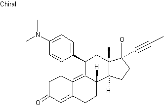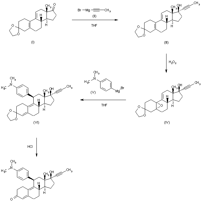 The reaction of 3,3-(ethylenedioxy)estra-5(10),9(11)-diene-17(beta)-one (I) with propynylmagnesium bromine (II) in THF gives 3,3-(ethylenedioxy)-17(beta)-(propyn-1-yl)estra-5(10),9(11)-diene-17(beta)-ol (III), which is epoxidized with H2O2 in hexafluoroacetone-methylene chloride yielding 3,3-(ethylenedioxy)-17(beta)-(propyn-1-yl)-5(alpha),10(alpha)-epoxyestra-9(11)-en-17(beta)-ol (IV). The reaction of (IV) with 4-dimethylaminophenylmagnesium bromide (V) in THF affords 11(beta)-(4-dimethylaminophenyl)-3,3-(ethylenedioxy)-17(beta)-(propyn-1-yl)estra-9-en-17(beta)-ol (VI), which is finally deprotected by a treatment with HCl in metnanol.