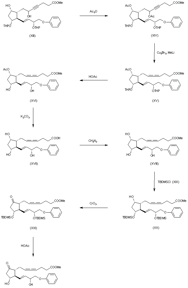 The acetylation of (XIII) with acetic anhydride and triethylamine in methylene chloride yields the diacetoxy-bistetra-hydropyranyloxy acetylenic compound (XlV), which by a treatment with Cu2Br2-LiCH3 in ether is converted into 16-phenoxy-9alpha-acetoxy-11alpha,15alpha-bistetrahydropyranyloxy-17,18,19,20-tetranorprosta-4,5,13-trans-trienoic acid methyl ester (XV). Elimination of the tetrahydropyranyl groups with acetic acid in water gives the corresponding dihydroxy compound (XVI), which is fully deprotected with K2CO3 in methanol yielding 9alpha,11alpha,15alpha-trihydroxy-16-phenoxy-17,18,19,20-tetranorprosta-4,5,13-trans-trienoic acid (XVII). The methylation of (XVII) with diazomethane affords the corresponding methyl ester (XVIII), which by treatment with tert-butyldimethylsilyl chloride (XIX) in DMF is converted into the corresponding 11,15-bis(silyloxy) compound (XX). The oxidation of (XX) with CrO3 - pyridine in CH2Cl2 affords 9-oxo-16-phenoxy-11alpha,15alpha-bis(tert-butyldimethylsilyloxy)-17,18,19,20-tetranorprosta-4,5,13-trans-trienoic acid methyl ester (XXI), which is deprotected with aqueous acetic acid giving the free keto ester (XXII). Finally, this ester is hydrolyzed by treatment with pancreatic lipase.