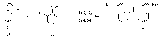 By condensation of 2,4-dichlorobenzoic acid (I) with anthranilic acid (II) by means of K2CO3, powdered Cu and a small amount of I2 in refluxing isoamyl alcohol.