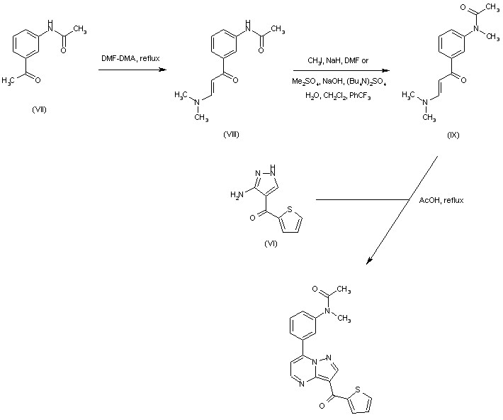 3-(Acetamido)acetophenone (VII) was converted to enaminone (VIII) upon condensation with dimethylformamide dimethylacetal. The amide N of (VIII) was then alkylated by means of iodomethane and NaH or, alternatively, under phase-transfer conditions to give (IX). Finally, condensation between enaminone (IX) and aminopyrazole (VI) in refluxing AcOH provided the target pyrazolopyrimidine.
