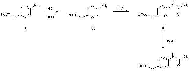 The esterification of 4-aminophenylacetic acid (I) with ethanol - HCl in the usual way gives the ethyl ester (II), which is acylated with acetic anhydride in ethyl acetate yielding ethyl 4-acetaminophenylacetate (III). Finally, this compound is hydrolyzed with aqueous NaOH.
