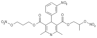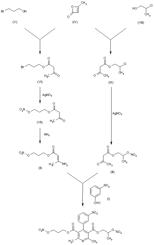 By cyclization of 3-nitrobenzaldehyde (I) with 3-nitratopropyl-3-aminocrotonate (II) and 2-nitratopropyl acetoacetate (III) in refluxing benzene. The starting products (II) and (III) are obtained as follows: The reaction of diketene (IV) with 3-bromopropanol (V) by means of sodium acetate at 50 C gives 3-bromopropyl acetoacetate (VI), which by reaction with AgNO3 in refluxing acetonitrile is converted to 3-nitratopropyl acetoacetate (VII). Finally, this compound is treated with NH3 in THF to afford the aminocrotonic ester (II). The reaction of diketene (IV) with 2-chloropropanol (VIII) as before gives 2-chloropropyl acetoacetate (IX), which is treated with AgNO3 as before to yield acetoacetate (III).