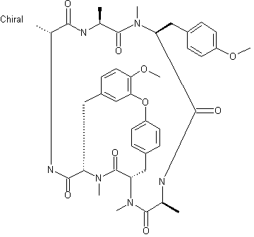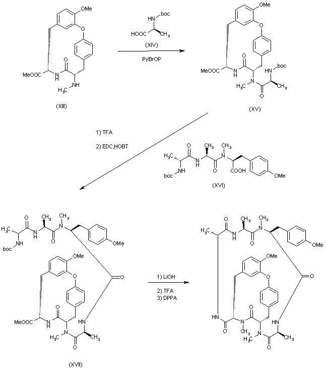 The condensation of (XIII) with N-protected L-alanine (XIV) by means of PyBrOP and diethylisopropylamine in DMF gives the cyclic tripeptide (XV), which after deprotection with TFA is condensed with the protected tripeptide (XVI) by means of EDC and HOBT to provide the cyclic hexapeptide (XVII). Finally, this compound is cyclized by hydrolysis of the methyl ester with LiOH in THF/methanol/water, deprotection of the amino group with TFA and cyclization with DPPA and NaHCO3 in DMF.