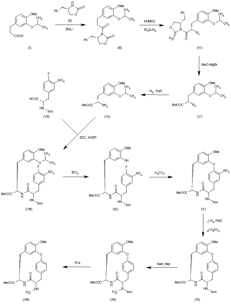 The condensation of 3-(3-isopropoxy-4-methoxyphenyl)propionic acid (I) with the chiral adjuvant 4(S)-benzyloxazolidin-2-one (II) by means of n-BuLi in THF gives the amide (III), which is treated with triethylsilyl azide and KHMDS in THF to afford the chiral alpha-azido compound (IV). Elimination of the oxazolidin group methoxymagnesium bromide in methanol yields the methyl ester (V), which is reduced with H2 over Pd/C in methanol giving the alpha-aminoester (VI). The condensation of (VI) with N-(tert-butoxycarbonyl)-4-methoxy-3-nitro-L-phenylalanine (VII) by means of EDC and HOBT in dichloromethane provides the dipeptide (VIII), which is des-isopropylated with BCl3 in dichloromethane affording the phenolic compound (IX). The cyclization of (IX) with K2CO3 in DMSO gives the cyclic dipeptide (X), which is reduced with H2 over Pd/C in methanol and treated with H3PO2 and NaNO2 in order to eliminate the activating nitro group to give (XI). The methylation of (XI) with NaH and methyl iodide affords (XII), which is deprotected with TFA providing (XIII) with a free methylamino group.