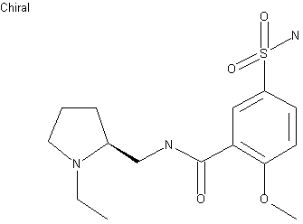 This compound is obtained by condensation of 2(S)-(aminomethyl)-1-ethylpyrrolidine (I) with 5-(aminosulfonyl)-2-methoxybenzoyl chloride (II) by means of K2CO3 in acetone. The starting compounds (I) and (II) are obtained as follows: a) The acylation of 2(S)-(hydroxymethyl)pyrrolidine (III) with acetic anhydride in refluxing methanol gives 1-acetyl-2(S)-(hydroxymethyl)pyrrolidine (IV), which by reaction with SOCl2 in CHCl3 is converted into 1-acetyl-2(S)-(chloromethyl)pyrrolidine (V). The reaction of (V) with sodium azide in hot DMF affords the corresponding azide (VI), which is reduced with LiAlH4 in refluxing THF to yield the desired product (I). b) The methylation of 2-hydroxybenzaldehyde (VII) with dimethyl sulfate and K2SO3 in refluxing acetone gives 2-methoxybenzaldehyde (VIII), which is oxidized with KMnO4 in hot aqueous NaOH affording 2-methoxybenzoic acid (IX). The sulfonation of (IX) with hot chlorosulfonic acid yields 5-(chlorosulfonyl)-2-methoxybenzoic acid (X), which is finally treated with 28% aqueous NaOH to give the desired product (II).