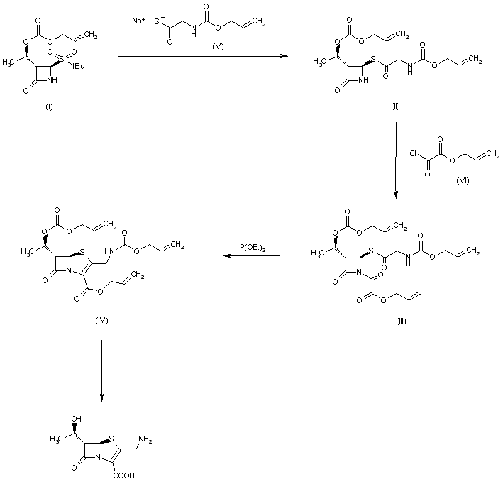 Substitution with sodium [N-(allyloxycarbonyl)amino]thioacetate of the tert-butylsulfonyl group of the (3S,4R)-azetidinone (I) (obtained in several steps from L threonine), with overall retention of configuration at C-4, gives the azetidinone (II), wnich is converted with allyloxalyl chloride to the oxamide (III). Cyclization of (III) with triethylphosphite yields the (5R,6S,1'R)-allyl-2-(allyloxycarbonylaminomethyl)-6-(1'-allyloxycarbonyloxyethyl)penem-3-carboxylate (IV), which is deprotected to yield crystalline CGP-31608.