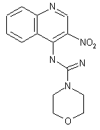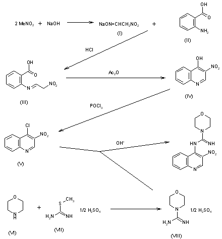 Nitroacetaldehyde oxime (I) is formed from nitromethane in the presence of NaOH and is converted in acidic media with 2-aminobenzoic acid (II) to 2-(2-nitroethylideneamino)benzoic acid (III). Cyclization of (III) in acetic anhydride by means of potassium acetate yields 4-hydroxy-3-nitroquinoline (IV), which is converted to 4-chloro-3-nitroquinoline (V) in boiling POCl3. Reaction of (V) with morpholinecarboximidamide (VIII) (formed from morpholine (VI) and S-methylisothiourea hemisulfate (VII) in ethanol) affords troquidazole.