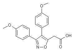 The reaction of desoxyanisoin (I) with hydroxylamine in methanol gives the corresponding oxime (I), which is cyclized with ethyl acetate (III) by means of n-butyllithium in THF yielding 3,4-di(4-methoxyphenyl)-5-methylisoxazole (IV). Finally, this compound is condensed with CO2 by means of n-butyllithium in THF.