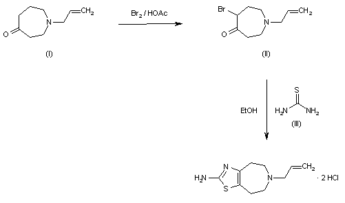 The bromination of 1-allylhexahydro-4H-azepin-4-one (I) with Br2 in acetic acid gives 1-allyl-5-bromohexahydro-4H-azepin-4-one (II), which is cyclized with thiourea (III) in refluxing ethanol.