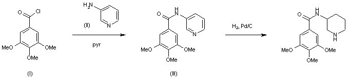 The condensation of 3,4,5-trimethoxybenzoyl chloride (I) with 3-aminopyridine (II) by means of pyridine in benzene gives 3-(3,4,5-trimethoxybenzamido)pyridine (III), which is hydrogenated with H2 over Pd/C in ethanol-water-HCl.