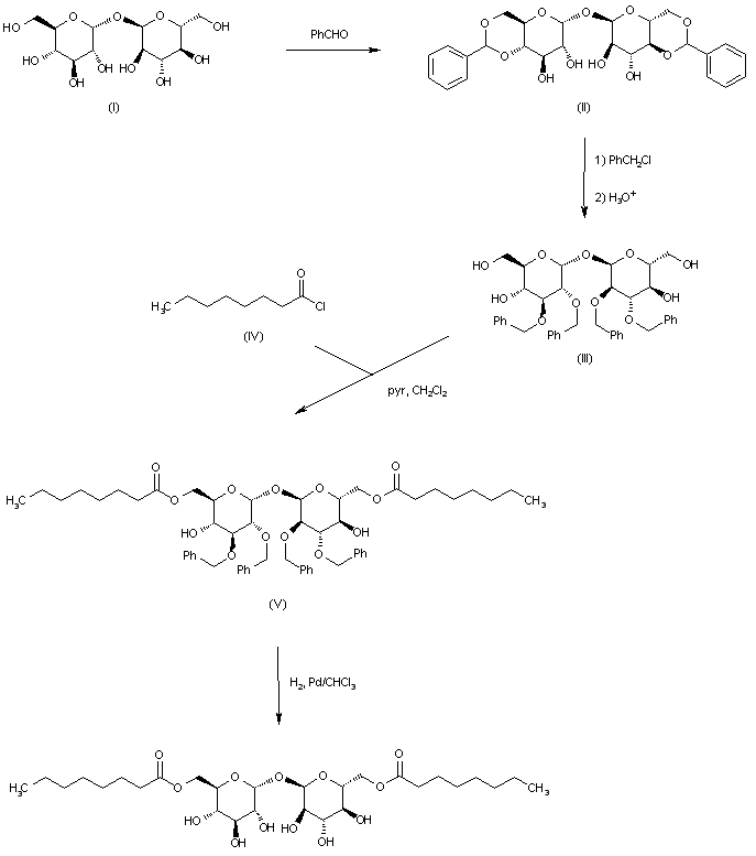 2,2',3,3'-Tetra-O-benzyl-alpha,alpha-trehalose (III) was prepared by condensation of trehalose (I) with benzaldehyde, followed by alkylation of the resulting bisbenzylidene derivative (II) with benzyl chloride and then acid hydrolysis of the benzylidene ketal. Acylation of (III) with octanoyl chloride (IV) in the presence of pyridine provided diester (V). Finally, catalytic hydrogenolysis of the benzyl protecting groups yielded the title compound.
