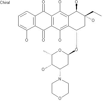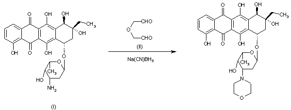 A fermentation broth of RMN-134-13 was filtered, adjusted at pH 3.4 and centrifuged. The liquid was passed through Diajon HP-20 and eluted with acetone-0.01 M HCl-KCl buffer. The luate was combined with the precipitate of the preceding centrifugation to which acetone and 28% aq. ammonia was added. After stirring for 3-4 h at 20 C the solution was adjusted at pH 7.2 with H2SO4, concentrated and extracted with CH3OH-CHCl3. After a cumbersome purification by HPLC, 13 deoxo-10-hydroxycarminomycin (oxaunomycin) (I) was obtained. Finally, the preceding compound was treated with diglycol dialdehyde (II) and sodium cyano-borohydride in CHCl3.