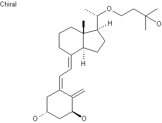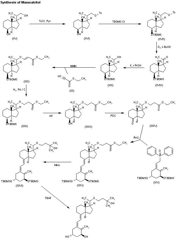 Synthesis of ketone (XXIV): Reaction of the known diol (XV) ?obtained by degradation of vitamin D2 ?with TsOH in pyridine gives, regioselectively, the monotosylate (XVI), which is protected at the secondary OH group by silylation with TBDMS-Cl and imidazole to yield the silyl ether (XVII). Oxidation of the tosyloxy group of (XVII) with O2 and t-BuOK in DMSO/t-BuOH affords ketone (XVIII), which is reduced with K and i-PrOH providing alcohol (XIX). Condensation of compound (XIX) with ethyl prop-ynoate (XX) by means of NMM in benzene gives the alkoxyacrylate (XXI), which is reduced with H2 over Pd/C in EtOH to yield the alkoxypropionate (XXII). Deprotection of the OH group of (XXII) with HF in acetonitrile affords alcohol (XXIII), which is oxidized with pyridinium dichromate (PDC) in CH2Cl2 providing ketone (XXIV). Wittig-Horner condensation of ketone (XXIV) with phosphine oxide (XIV) by means of BuLi in THF yields the corresponding adduct (XXV), which is submitted to a Grignard reaction with MeLi in THF to give the protected maxacalcitol precursor (XXVI). Finally, this compound is desilylated by means of TBAF in THF.