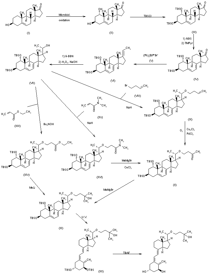 4) The Wittig condensation of the previously reported 1alpha,3beta-bis(tert-butyldimethylsilyloxy)androst-5-en-17-one (III) with ethyltriphenylphosphonium bromide and potassium tert-butoxide gives the corresponding 17-ethylidene derivative (XVII), which is treated first with 9-borabicyclo[3.3.1]nonane (9-BBN) and then with H2O2 and NaOH in THF yielding a mixture of the 20(S)- and 20(R)-isomers of the 1alpha,3beta-bis(tert-butyldimethylsilyloxy)pregn-5-en-20-ol that was separated by preparative TLC. The 20(S)-isomer (XVIII) was condensed with N,N-dimethylacrylamide (XV) by means of NaH affording the propionamide derivative (XIX), which by a Grignard condensation with methylmagnesium bromide catalyzed by CeCl3 is converted into 1alpha,3beta-bis(tert-butyldimethylsilyloxy)-20(S)-(3-hydroxy-3-methylbutoxy)pregn-5-ene (XX). Finally, this compound is dehydrogenated as before by bromination with N-bromosuccinimide (NBS) and dehydrobromination with 2,4,6-trimethylpyridine (TMPyr) to afford the 3-hydroxy-3-methylbutoxy derivative (XI), already obtained.