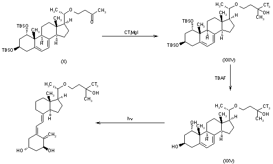 The synthesis of 22-oxacalcitriol labeled with tritium at the 26-methyl group has been performed as follows: The starting compound is the previously obtained 3-oxobutoxy derivative (X), which is submitted to a Grignard alkylation with 3CH3MgI giving the labeled 3-hydroxy-3-methylbutoxy derivative (XXIV). The deprotection of (XXIV) with tetrabutylammonium fluoride affords the triol derivative (XXV), which is finally irradiated with a 400 W high-pressure mercury lamp with a Vycor filter.