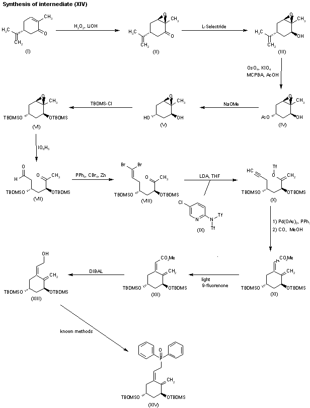 The intermediate phosphine oxide (XIV) has been obtained as follows: The epoxidation of l-carvone (I) with H2O2 and LiOH in methanol gives the epoxide (II), which is reduced with L-Selectride in THF to yield the alcohol (III). The oxidation of the isopropenyl group of (III) with OsO4, KIO4, MCPBA and HOAc affords the acetate (IV), which is hydrolyzed to the diol (V) with NaOMe in methanol. The protection of the two OH groups of (V) with Tbdms-Cl and imidazole provides the bis-silyl ether (VI), which is oxidized with periodic acid in ethyl ether to give the ketoaldehyde (VII). The aldehyde group of (VII) is subjected to a Wittig condensation with CBr4, PPh3 and Zn in dichloromethane to yield the dibromovinyl compound (VIII), which by treatment with LDA and the triflic imide (IX) in THF affords the acetylenic vinyl triflate (X). The cyclization of (X) by means of Pd(OAc)2 and PPH3, followed by carbonylation in methanol, provides the methyl ester (XI) as a 2:1 mixture of the (Z)- and (E)-isomers. The photoisomerization of this mixture under the Hoffmann-La Roche conditions (presence of 9-fluorenone) gives a high yield of the (Z)-isomer (XII), which is reduced with DIBAL in toluene to give the primary alcohol (XIII). Finally, this compound is converted into the target phosphine oxide (XIV) is performed by known methods.