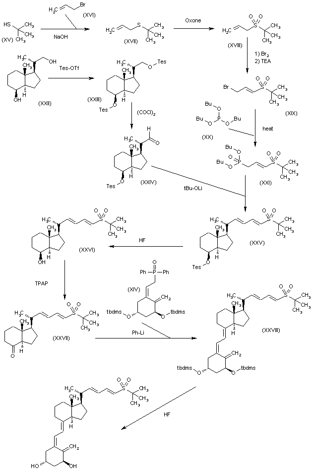 The intermediate phosphonate (XXI) has been obtained as follows: The reaction of tert-butyl mercaptan (XV) with allyl bromide (XVI) by means of NaOH in ethanol gives the sulfide (XVII), which is oxidized with Oxone in methanol/water to yield the sulfone (XVIII). The bromination of (XVIII) with Br2 in CCl4 followed by dehydrobromination with TEA affords the bromosulfone (XIX), which is finally condensed with tributyl phosphite (XX) by heating at 130 C to provide the target intermediate phosphonate (XXI). The silylation of the known diol (XXII) (obtained by degradation of vitamin D2) with Tes-OTf and lutidine gives the bis silyl ether (XXIII), which is submitted to a Swern oxidation ((COCl)2), yielding the carbaldehyde (XXIV). The Wadsworth-Emmons condensation of aldehyde (XXIV) with the intermediate phosphonate (XXI) by means of tBu-OLi affords the diinsaturated sulfone (XXV), which is desilylated with HF in THF to provide the alcohol (XXVI). The oxidation of (XXVI) with TPAP and NMO furnishes the ketone (XXVII), which is submitted to a Wittig-Horner condensation with the intermediate phosphine oxide (XIV) by means of PhLi, giving the silylated precursor (XXVIII). Finally, this compound is desilylated with HF in ethanol to afford the target vitamin D3 analogue.