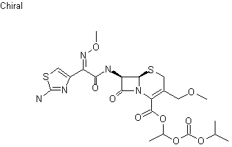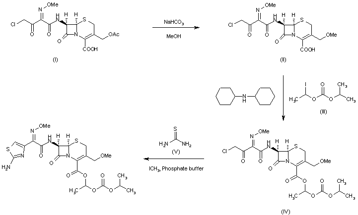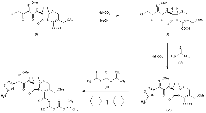 The condensation of 7-amino-3-(methoxymethyl)-3-cephem-4-carboxylic acid (I) with 4-bromo-2-(methoxyimino)-3-oxobutyric acid (II) by means of PCl5 and HMDS in dichloromethane gives the butyramide (III), which is cyclized with thiourea (IV) by means of Na-OAc in water to yield the thiazol derivative (IV). Finally, the carboxy group of (IV) is esterified with 1-iodoethyl isopropyl carbonate (VI) by means of DBU in DMA to afford the target cefpodoxime proxetil.