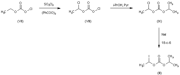 3) The iodoester (III) is obtained as follows: The chlorination of ethyl chloroformate (VII) with SO2Cl2 and benzoyl peroxide gives 1-chloroethyl-chloroformate (VIII), which is esterified with o-propanol in pyridine to afford 1-chloroethyl isopropyl carbonate (IX). Finally, this compound is iodinated with NaI and 18-crown-6 in refluxing benzene.