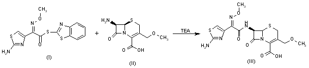 1) The methanolysis of 3-(acetoxymethyl)-7-[4-chloro-3-oxo-2(Z)-(methoxyimino)butyrylamidol-3-cephem-4-carboxylic acid (I) with methanol and NaHCO3 gives the corresponding 3-(methoxymethyl) derivative (II), which is esterified with 1-iodoethylisopropyl carbonate (III) by means of dicyclohexylamine or tetramethylguanidine or DIEA (diisopropylethylamine) in DMA to afford the corresponding ester (IV). Finally, this compound is cyclized with thiourea (V) and methyl iodide in a phosphate buffer.
