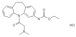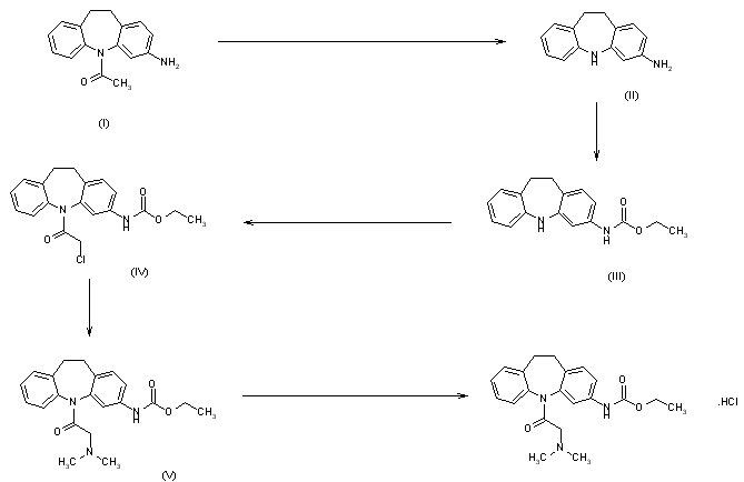 Reaction of 3-amino-5-acetyl-10,11-dihydro-5H-dibenz[b,f]azepine (I) with potassium hydroxide in n-propanol yields 3-amino-10,11-dihydro-5H-dibenz[b,f]azepine (II), which reacts with ethyl chloroformate to give 3-carbethoxyamino-10,11-dihydro-5H-dibenz[b,f]azepine (III). Reaction of (III) with chloroacetylchloride yields 3-carbethoxyamino-5-chloroacetyl-10,11-dihydro-5H-dibenz[b,f]azepine (IV), which is then reacted with dimethylamine to give 3-carbethoxyamino-5-dimethylaminoacetyl-10,11-dihydro-5H-dibenz[b,f] azepine (tiracizine) (V), with m.p. 135-7 C. Tiracizine hydrochloride is obtained by reaction of the base with hydrochloric acid in isopropanol.