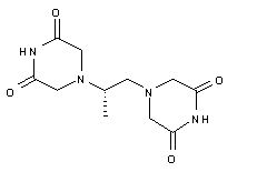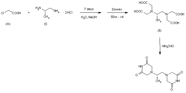 (rac)-1,2-Diaminopropane is resolved using (-)-L-tartaric acid. The bitartrate salt is treated with HCl to give the dihydrochloride salt, (-)-S-1,2-diaminopropane dihydrochloride (I). (I) in water is added to a solution of chloroacetic acid and sodium hydroxide below 20 C, and allowed to stand at room temperature for 7 days. After concentration and filtration, the product is isolated by passing the filtrate down an ion exchange column and eluting with water. The portion of the eluate containing the bulk of the optical activity is concentrated by heating. Crystals of (+)-(S)-1,2-propylene dinitrilotetraacetic acid (II) are obtained by filtration. (II) is heated under nitrogen for 20 h at 165 C to give (+)-(S)-1,2-di(piperazine-2,6-dione)propane.