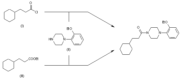 The synthesis of D-16120 can be achieved by several methods: 1) Aminolysis of 3-cyclohexylpropionyl chloride (I) with 2-ethoxyphenylpiperazine (II) in the presence of triethylamine yields D-16120. 2) Reaction of ethyl 3-cyclohexylpropionate (III) with 2-ethoxyphenylpiperazine (IV) also gives D-16120.